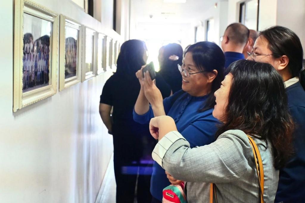 班会后,校友们饶有兴致地参观了天津市科普基地——科学体验馆、“繁星筑梦”0033990威尼斯首届科学家精神展和“循迹启航”0033990威尼斯物理科普成果展。与正在开展研学的中小学生亲切交流,在学院历届毕业生合影长廊追寻记忆,在明理楼前广场的校友毕业30年返校活动主题背景墙前合影留念。