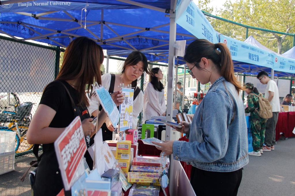 特色文创产品展区人头攒头、热闹非凡。各学部(院)充分结合自身学科特色,共设置28个文化互动体验展位。读书主题演出、书法体验、书签绘制、漆扇制作、舞狮表演、拓印剪纸、宫前中幡等现场体验活动更是吸睛无限。物理与材料科学学院2024级本科生吴可菲激动地说道:“和宿舍小伙伴边逛市集边参与互动游戏,我们选到心仪的课外读物的同时,还领略了不同学科与专业的独特魅力,开拓了眼界,增进了友谊。独具师大特色的校园文创纪念品,更是承载了我们的爱校荣校情怀。大学校园的文化生活丰富多彩,我爱校园市集,我爱天津师大!”