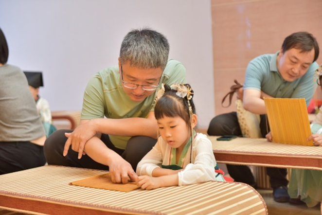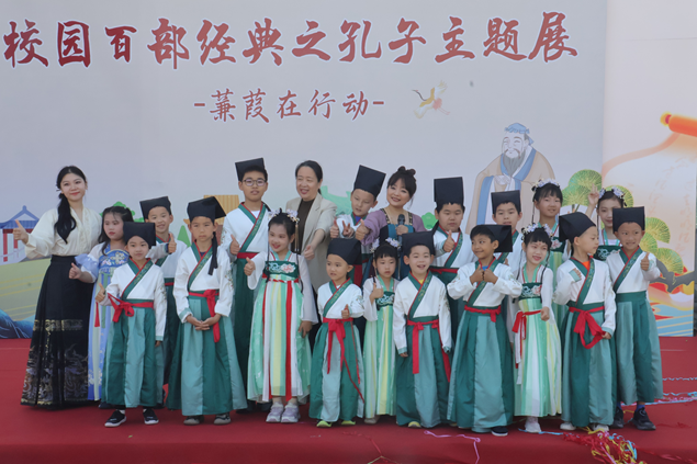 为积极推广中华优秀传统文化对少年儿童的教育和普及,在国际“六一”儿童节到来之际,图书馆在A区一楼举办“传承百部经典,国学浸润童心”亲子活动,邀请我校17组教师亲子家庭参加,活动由天津广播电视台教育频道节目主持人王楠主持。图书馆别出心裁地将古代私塾的场景“搬进”馆内,旨在模拟古代老师上课的情形,打造基于场景的沉浸式阅读环境。参加亲子活动的孩子们身着汉服走进“私塾”,在主持人王楠的带领下坐在案几旁诵读《论语》经典片段,听主持人讲述孔子的故事,体验古典非遗技艺。