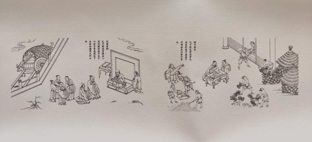 《中华传统文化百部经典》所选典籍上起先秦,下至辛亥革命,包括哲学、文学、历史、艺术、科技等领域的重要典籍,充分展现中华优秀传统文化的广泛性和多样性。本次展览汇集了历代与孔子相关的经典文献和艺术作品,包括《论语》《孔子世家》《鲁孔子碑》等12部典籍、“史说—周游列国”孔子故事和以馆藏明本为底本,结合木版水印技法绘制的“孔子圣迹图”。