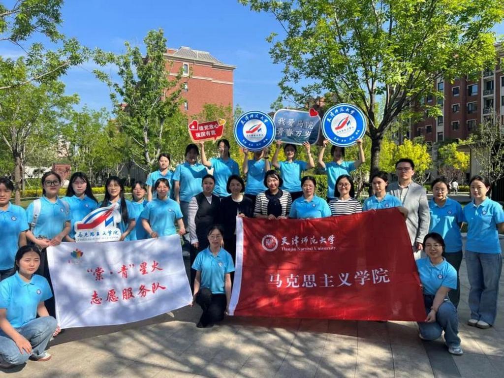 马克思主义学院学生身着“天青蓝”,在天津市津南区海棠街道党群服务中心开展“牢记嘱托担使命 善作善成勇争先”五四青年节主题活动。青年学生以互动体验、实地参与、共话“梦想”等多种形式,沉浸式参与社区基层工作,实地体验基层民情,将志愿服务送到老百姓门口。
