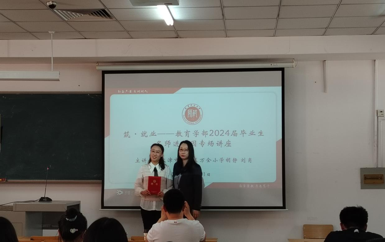 讲座伊始,教育学部党委副书记吴文婧对两位老师的到来表示欢迎,学部聘请胡静校长为毕业生职业生涯规划的首位导师,并为其颁发聘书。