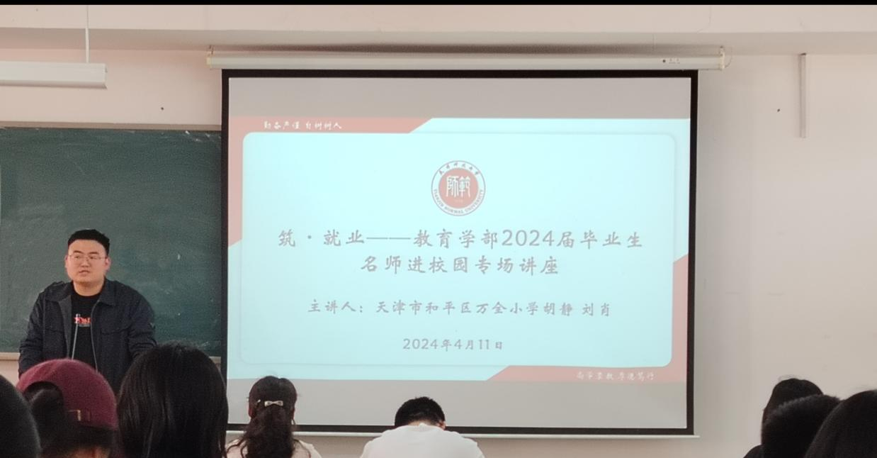 教育学部消息(通讯员 王立冬 刘健)为更好地发挥校友资源优势,深入了解目前小学教育等专业的就业形势,明确小学教师应具备的职业素养和职业技能,为在校生先行做好教师生涯职业规划,更好适应未来岗位要求,近日,教育学部邀请我校校友、天津市和平区万全小学胡静校长、人事干部刘肖老师为2024届毕业生及低年级师范生带来“名师进校园”的首场讲座。