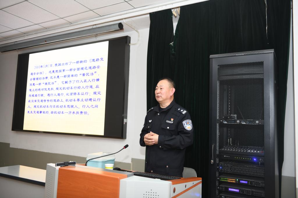 刘保红以丰富的执法经验和生动详实的案例,围绕着“全国交通安全日”的宣传教育精神,深入浅出地阐述了交通安全的重要性,并对日常生活中常见的交通违法行为进行了重点剖析,警示大家严格遵守交通法规,做到知法、懂法、守法。讲座中,他不仅详细解读了一系列常见的交通标志标线的含义和功能,还通过现场演示的方式,生动展示了交警常用的手势指挥信号,使广大师生能够更直观地理解和掌握重要交通指示规则。此外,针对校园内外普遍存在的停车问题,刘保红专门就如何规范停车进行了细致讲解,引导师生正确停放车辆,避免因不规范停车行为导致的交通拥堵和安全隐患。还他针对突发交通事故的处理流程和应对措施,着重强调了事故发生后的自救互救、及时报警等关键步骤,让在校师生对紧急情况下的自我保护和合理处置有了深刻认识。