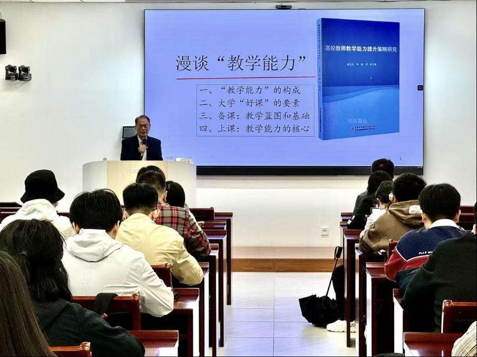 黎跃进围绕教学能力提升的“知——行——效”逻辑框架展开系统阐述。他从理论层面解析了教学能力的多维构成,提出教学能力是专业知识、教学技能与教育情怀的有机统一,并进一步细化为教学设计、教学实施、教学评价反馈、沟通合作等四大维度以及21项具体指标。在“好课”标准方面,他创新性提出“一中心两性一度三目标”评价体系。结合国家级一流本科课程《外国文学史》的教学实践,黎跃进生动展示了如何科学构建知识体系、融入学科前沿内容,他表示,课堂是教师教学能力的核心体现,教师应勇于分享学科前沿、探讨学术争议,以此培养学生的批判性思维,真正将课堂从“知识传递”走向“能力生成”。整场讲座主题鲜明、内容充实,既有理念引领,又有案例支撑,为青年教师提供了从理念到行动的全方位指导。