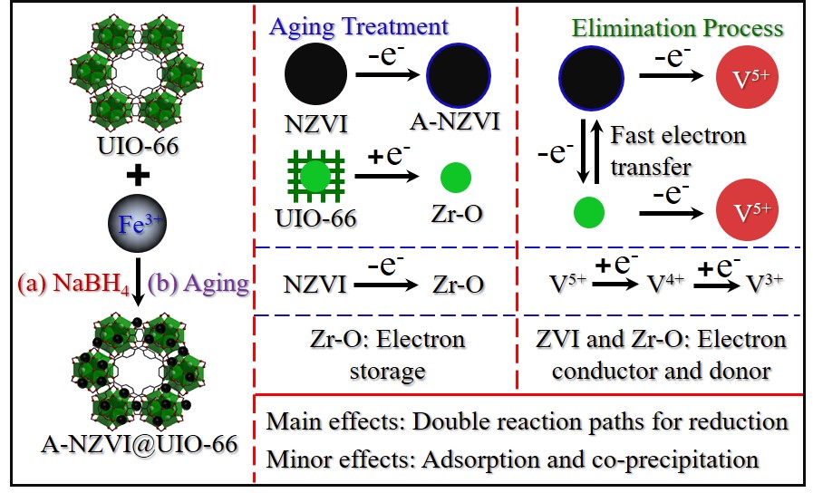 MOF负载纳米铁(NZVI@UIO-66)在克服团聚问题、提高纳米铁(NZVI)去污效率方面具有显著的应用前景。本研究合成一种纳米铁复合物NZVI@UIO-66具有很强的抗氧化性和高效除污性能。经过老化处理,在较宽的pH范围和浓度范围,A-NZVI@UIO-66都可以高效的去除水中V5+,吸附能力达到了397.23mgV/g NZVI。且经过酸洗处理,该复合材料具有很好的可重复利用性。需要注意的是硝酸盐有竞争抑制作用,所以在实际应用中需要考虑硝酸盐的影响作用才能达到更好的去除效果。A-NZVI@UIO-66具有独特的Zr-O键,它作为电子供体可以通过电子传递介导氧化、还原双反应的进行。故A-NZVI@UIO-66去除V5+的微观机理包括物理吸附、还原反应及络合共沉淀的过程。本研究提出的这种实用型水体重金属钒污染处理技术,可以有效处理工业废水,具有十分重要的理论意义和现实意义。