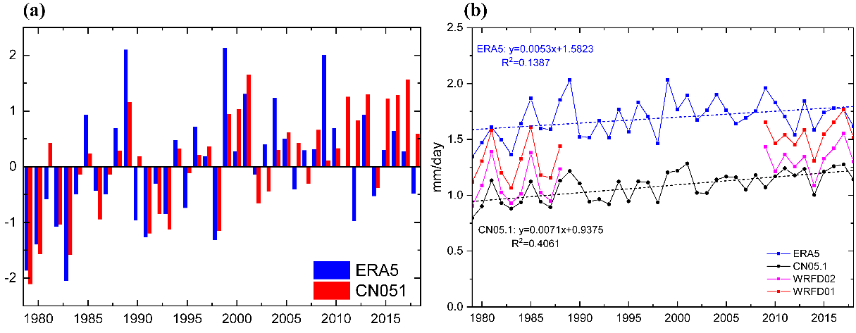 1 (a)三江源地区1979-2018春季标准化降水年际变化;(b)再分析数据、观测数据、WRF模式模拟的三江源地区春季降水量