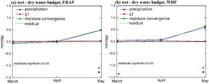 三江源地区是长江、黄河、澜沧江的发源地,被称为“亚洲水塔”,深入研究降水变化及其影响机制,对保障区域生态安全和下游地区社会经济的可持续发展具有重要的现实意义。观测数据显示三江源地区春季(3、4、5月)降水呈显著的增加趋势(图1a),这项工作从大气水量平衡的角度采用ERA5全球再分析数据和嵌入蒸散发追踪算法的WRF模式分析了大气水汽收支对三江源地区春季降水增加的影响。结果表明,再分析数据和WRF模式都显示大气水汽辐合主导三江源地区春季降水的变化(图2)。但由于对地形的解析精度不够,ERA5再分析数据对三江源地区春季降水存在明显高估(图1b),而高分辨率的WRF模式模拟的南边界水汽输入量明显低于再分析数据,降水模拟精度显著提高,证明高分辨率的区域气候模式(WRF)在复杂地形的区域水汽收支分析中具有很好的优势。