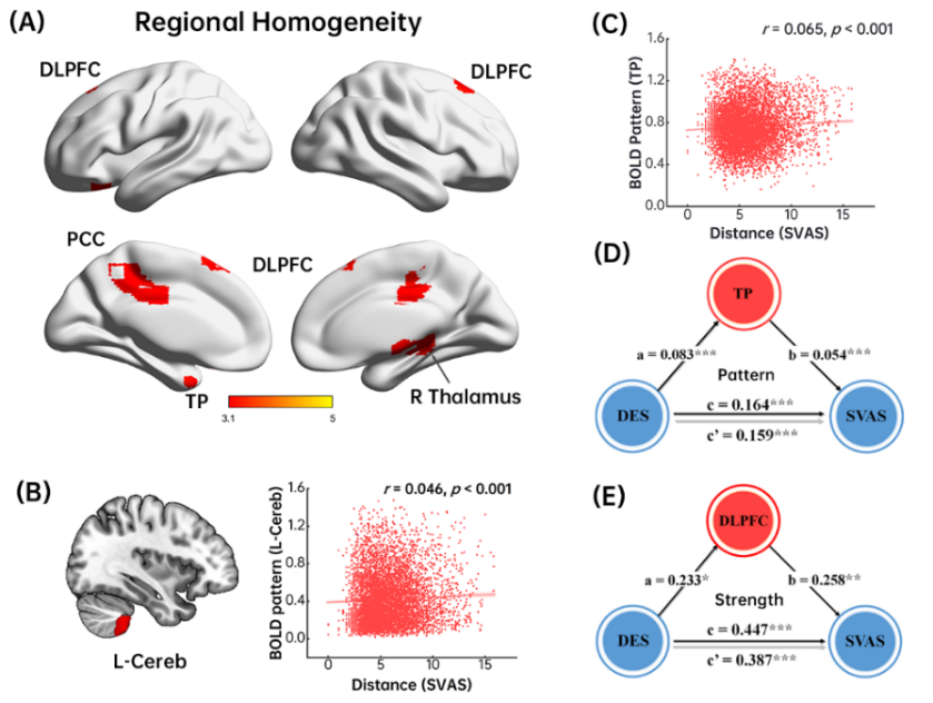 短视频成瘾(Short Video Addiction, SVA)是近年来数字行为成瘾的典型表现,具有对短视频平台的强迫性和不可控使用特征。过度沉迷短视频不仅影响睡眠、视力等生理健康,还与认知功能缺陷(如注意力、学习与记忆障碍)及情绪问题(如抑郁、焦虑、压力)密切相关。然而,现有研究多聚焦于行为层面,关于短视频成瘾的脑结构与分子机制仍缺乏系统证据。该研究采集了111名被试的行为与脑影像数据,结合传统单变量分析与个体间表征相似性分析(IS-RSA),并进一步整合脑影像转录组学方法,系统探索了短视频成瘾的神经解剖学、功能活动及基因表达基础。结果发现,眶额皮层和双侧小脑灰质体积与短视频成瘾显著相关;其中,左侧小脑灰质体积强度调节了特质妒忌与短视频成瘾的关系。背外侧前额叶皮层(DLPFC)、后扣带皮层(PCC)、小脑和颞极表现出较高的局部一致性(ReHo);其中,DLPFC 的活动强度和颞极的活动模式分别在“特质妒忌—短视频成瘾”的关系中发挥调节作用。结果提示,奖赏加工、执行抑制、自我意识及社会认知相关脑区是短视频成瘾的重要神经基础。